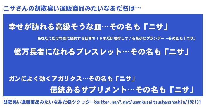 | 男性向けラノベタイトル風あだ名 | 『ニサアートオンライン』 |