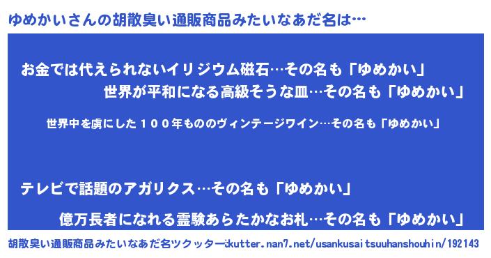 | 意味不明あだ名 | 『住所不定無職ゆめかい(4歳)』 |