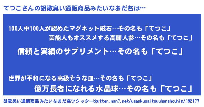 | ヒーロー風カッコイイあだ名 | 『魔戒騎士テツ』『愛の使者てつこ』 |