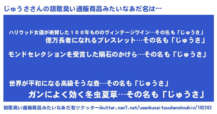 | 男性向けラノベタイトル風あだ名 | 『じゅうさに滅ぼされるだけの簡単なお仕事です』 |
