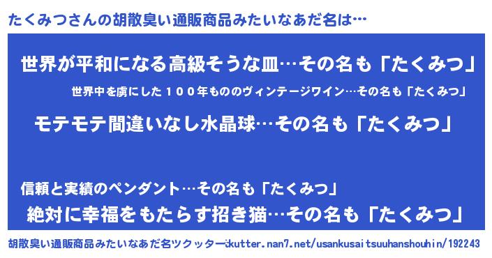 | 男性向けラノベタイトル風あだ名 | 『たくみつの憂鬱』『タクミツスレイヤー』 |