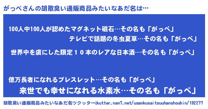 | 意味不明あだ名 | 『住所不定無職がっぺ(43歳)』『自称がっぺ』 |