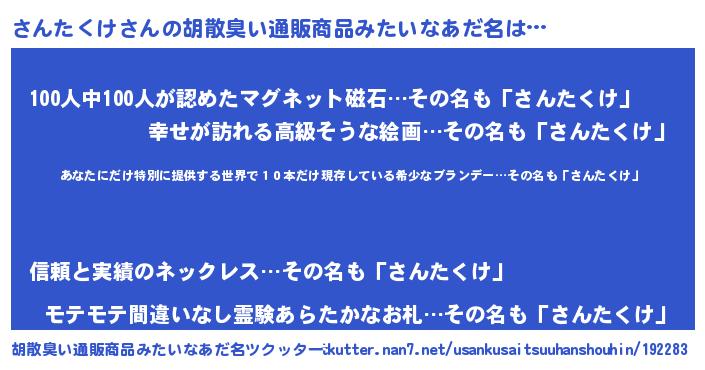 | 意味不明あだ名 | 『住所不定無職さんたくけ(91歳)』 |