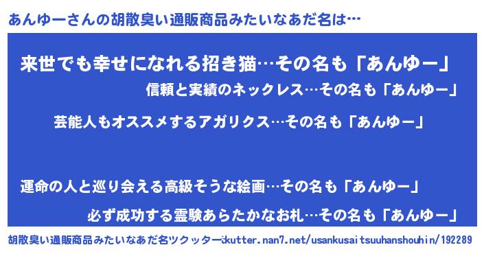 | 意味不明あだ名 | 『自称あんゆー』『永久保存あんゆー』 |