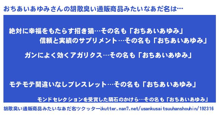 | ヘコむあだ名 | 『おちあいあゆみ(爆)』『おちお』 |