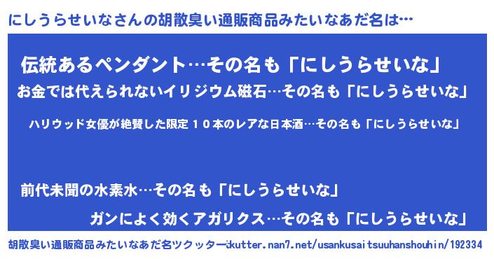 | 意味不明あだ名 | 『住所不定無職にしうらせいな(47歳)』 |