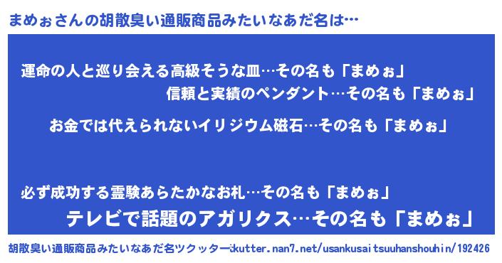| 伝説のあだ名 | 『魔王と互角に渡り合う占い師まめぉ』 |