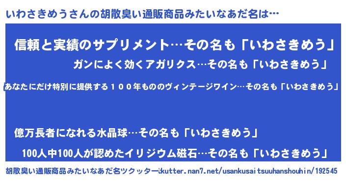 | 男性向けラノベタイトル風あだ名 | 『いわさきめう~年齢イコール彼女いない歴の魔法使い~』 |