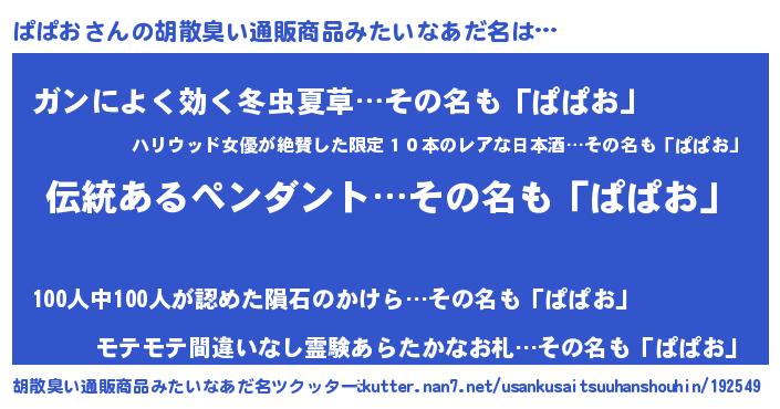 | 男性向けラノベタイトル風あだ名 | 『ぱぱおに滅ぼされるだけの簡単なお仕事です』 |