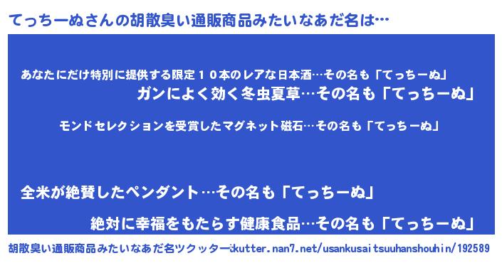 | 男性向けラノベタイトル風あだ名 | 『てっちーぬに滅ぼされるだけの簡単なお仕事です』 |