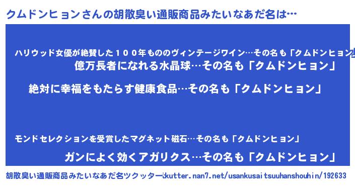 | 男性向けラノベタイトル風あだ名 | 『クムドンヒョンという概念が存在しない退屈な世界 』 |