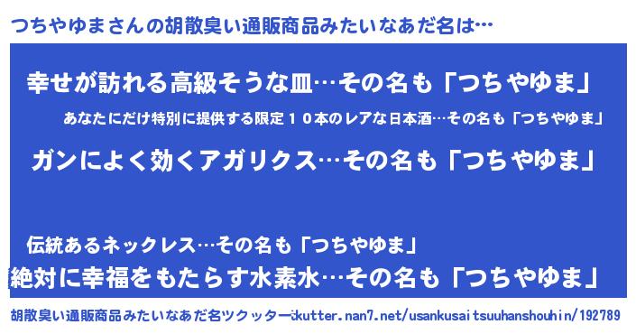 | 意味不明あだ名 | 『自称つちやゆま』『永久保存つちやゆま』 |