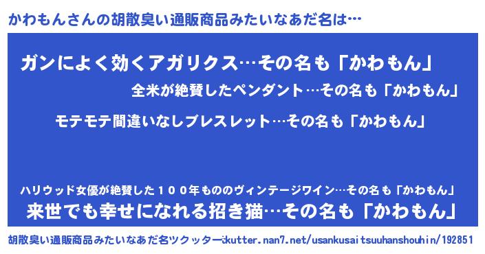 | ヒーロー風カッコイイあだ名 | 『スーパーカワモン』『究極戦士カワモン』 |