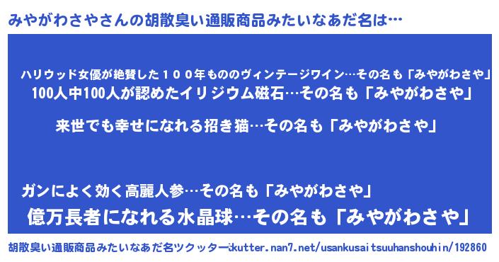 | ヘコむあだ名 | 『みやがわさや(笑)』『みやふぇ~』 |