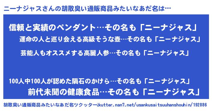 | 男性向けラノベタイトル風あだ名 | 『Re:ニーナジャスから始める異世界生活』 |