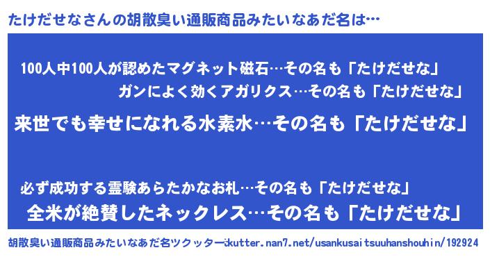 | ヘコむあだ名 | 『たけだせな(苦笑)』『たけお』 |