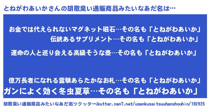 | 肩書あだ名 | 『とねがわあいか大統領』 |
