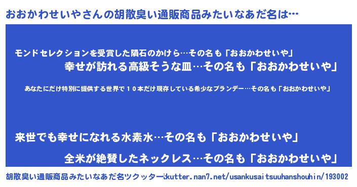 | 意味不明あだ名 | 『住所不定無職おおかわせいや(91歳)』 |