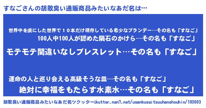 | ヘコむあだ名 | 『すなふぇ~』『すなご(苦笑)』 |
