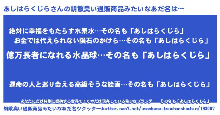 | ヘコむあだ名 | 『あしにゅー』『あしはらくじら(苦笑)』 |