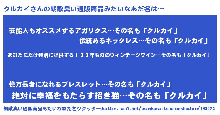 | 意味不明あだ名 | 『住所不定無職クルカイ(1歳)』 |