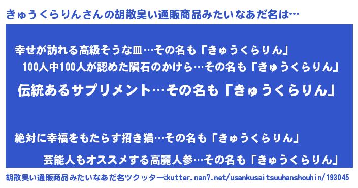 | 男性向けラノベタイトル風あだ名 | 『転生したらきゅうくらりんだった件』 |