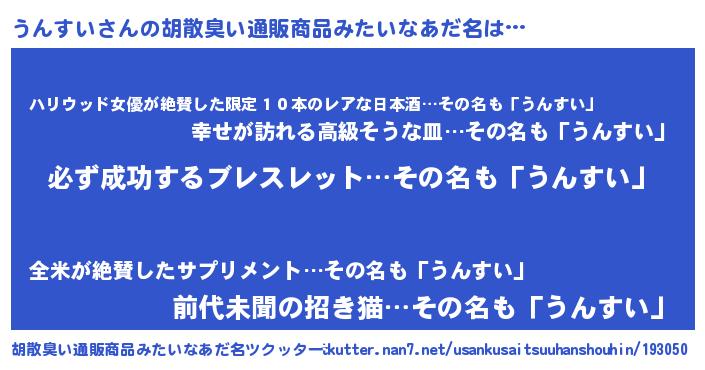 | 男性向けラノベタイトル風あだ名 | 『うんすいの憂鬱』『緋弾のウンスイ』 |
