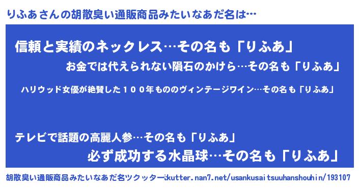| 意味不明あだ名 | 『住所不定無職りふあ(12歳)』 |