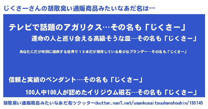 | 男性向けラノベタイトル風あだ名 | 『じくさー~年齢イコール彼女いない歴の魔法使い~』 |