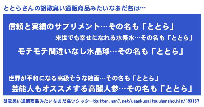 | ヘコむあだ名 | 『ととにゅー』『ととっ子』 |