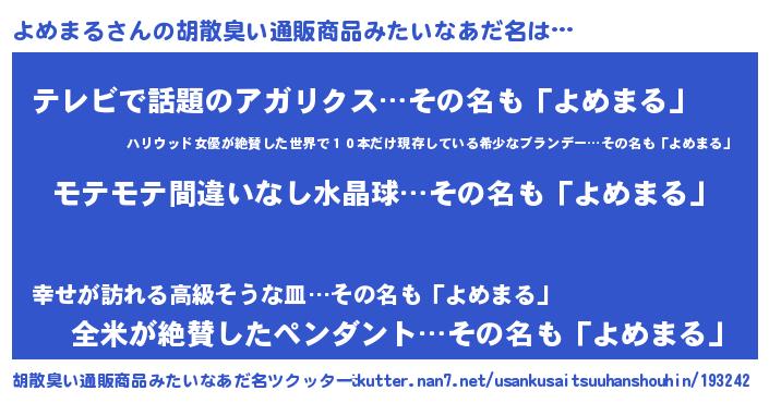 | 意味不明あだ名 | 『ペロリンよめまる』『自称よめまる』 |