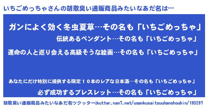| 男性向けラノベタイトル風あだ名 | 『いちごめっちゃ~年齢イコール彼女いない歴の魔法使い~』 |