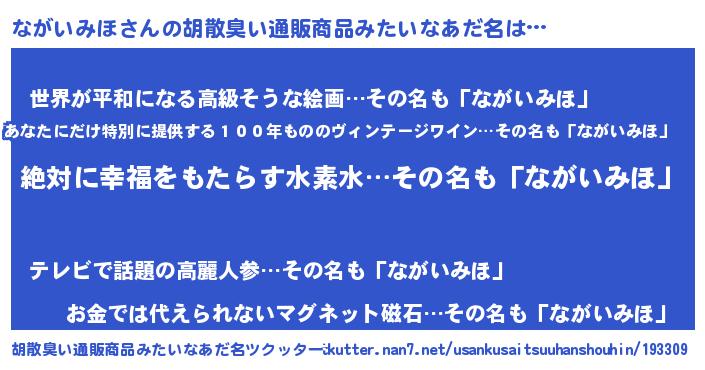 | 女子向けラノベタイトル風あだ名 | 『異世界で失敗しない100のながいみほ』 |