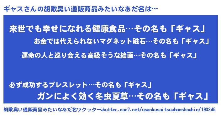 | 男性向けラノベタイトル風あだ名 | 『ギャス~年齢イコール彼女いない歴の魔法使い~』 |