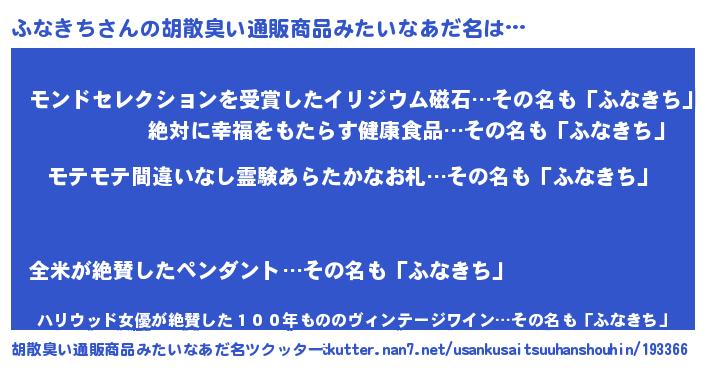 | 男性向けラノベタイトル風あだ名 | 『ふなきちの憂鬱』『フナキチスレイヤー』 |