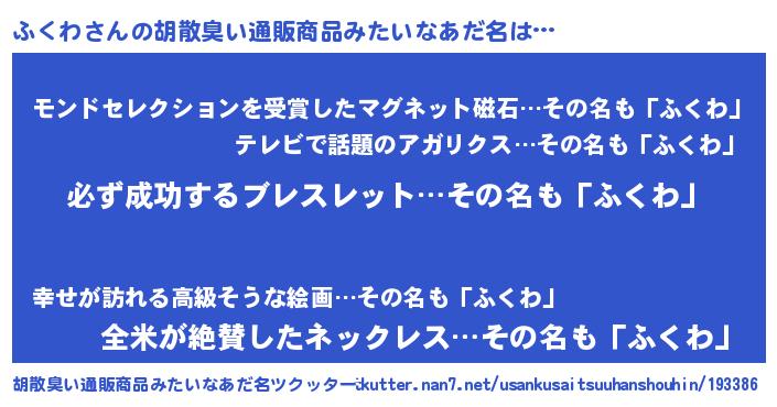 | 男性向けラノベタイトル風あだ名 | 『フクワスレイヤー』『ふくわの憂鬱』 |