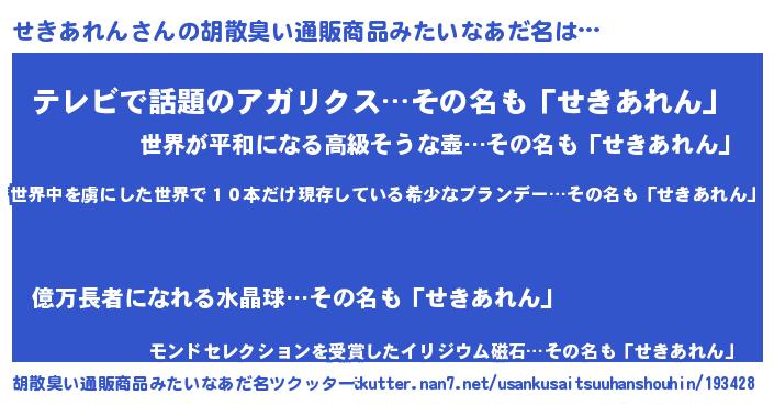 | 意味不明あだ名 | 『住所不定無職せきあれん(89歳)』 |