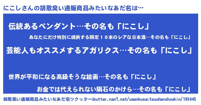 | 意味不明あだ名 | 『自称にこし』『とにかく怪しいにこし』 |
