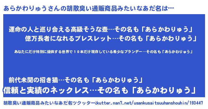 | 意味不明あだ名 | 『住所不定無職あらかわりゅう(77歳)』 |