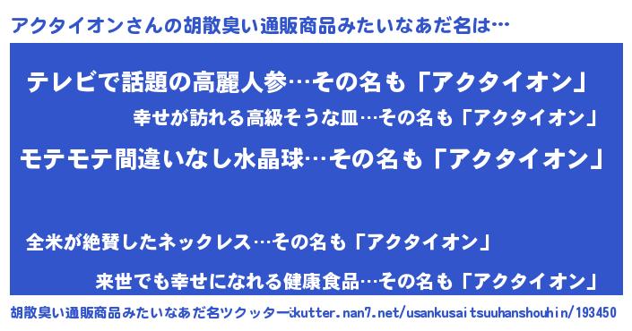 | 女子向けラノベタイトル風あだ名 | 『アクタイオン姫と円卓の騎士』 |