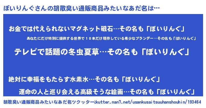 | 男性向けラノベタイトル風あだ名 | 『Re:ぼいりんぐから始める異世界生活』 |