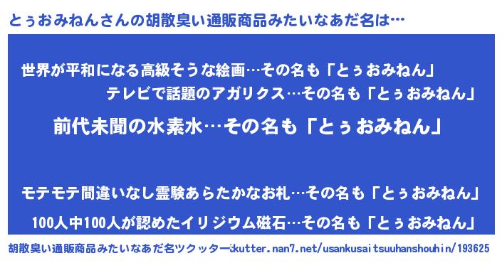 | 男性向けラノベタイトル風あだ名 | 『うちのとぅおみねんが世界を掌握している!』 |