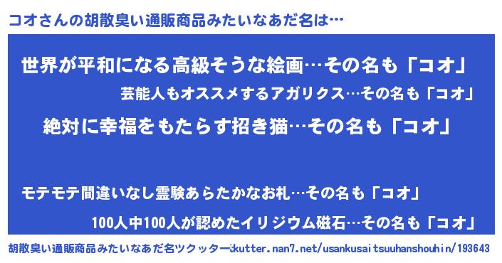 コオさんの胡散臭い通販商品みたいなあだ名をツクッター!