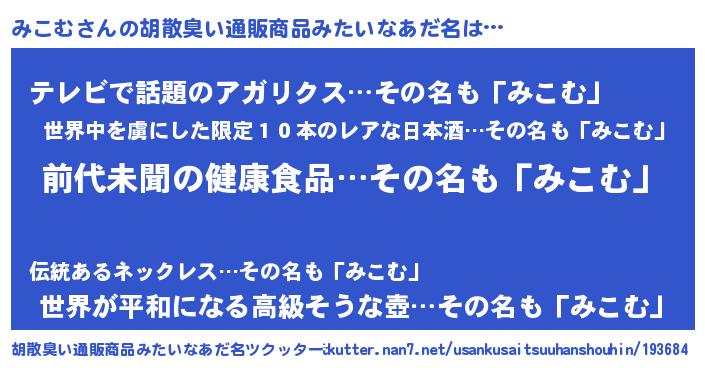 | 意味不明あだ名 | 『永久保存みこむ』『エリンギ科みこむ属』 |