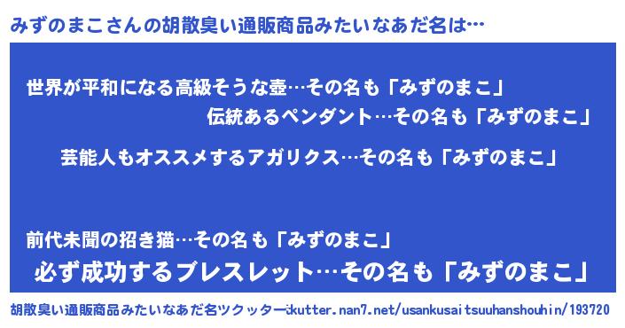 | 男性向けラノベタイトル風あだ名 | 『みずのまこ~年齢イコール彼女いない歴の魔法使い~』 |