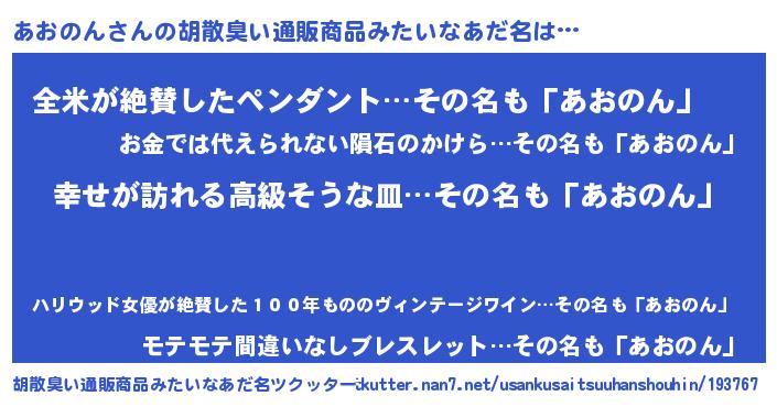 | 男性向けラノベタイトル風あだ名 | 『アオノンスレイヤー』『あおのんの憂鬱』 |