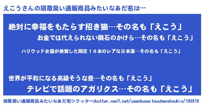 | ヘコむあだ名 | 『えこう(苦笑)』『牛乳』『えこ太郎』 |