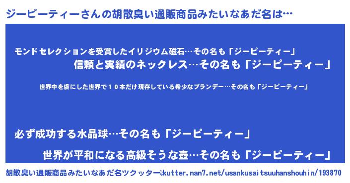 | 男性向けラノベタイトル風あだ名 | 『この素晴らしい世界にジーピーティーを!』 |