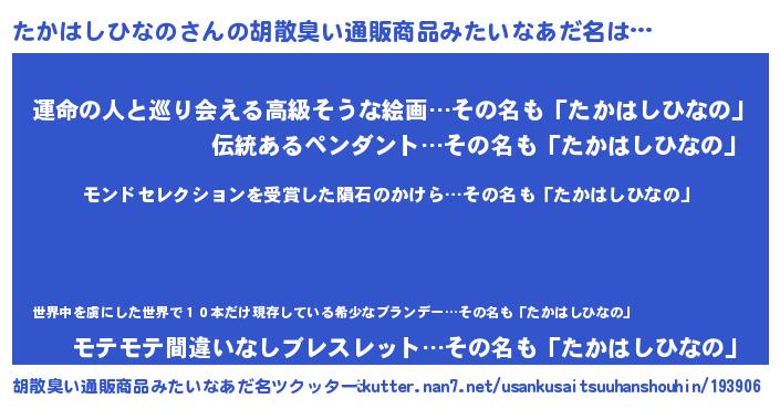 | 男性向けラノベタイトル風あだ名 | 『うちのたかはしひなのが世界を掌握している!』 |
