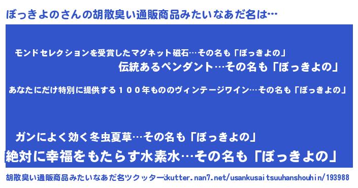 | 意味不明あだ名 | 『住所不定無職ぼっきよの(9歳)』 |